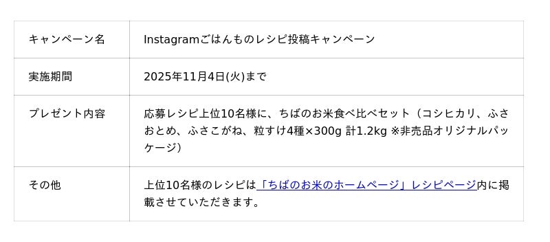 千葉県や米関連団体などで構成し、県民等への千葉県産米の消費拡大を図ること等を目的に活動する「千葉県産米需要拡大推進協議会(代表者:松元 善一)/事務局:千葉県農林水産部生産振興課(千葉県千葉市中央区市場町1-1)/キャンペーン運営事務局:株式会社オニオン新聞社(千葉県千葉市中央区中央3-3-1)」では、おいしい千葉の新米を広くPRするため、2025年11月4日(火)までの応募期間限定で、上位10名の方に「ちばのお米食べ比べセット(非売品)」をプレゼントするInstagramごはんものレシピ投稿キャンペーンを実施中です。