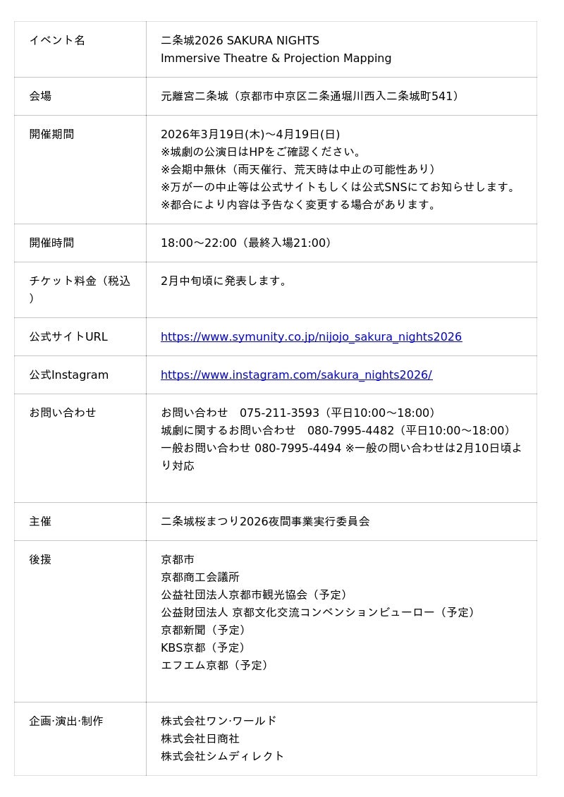 世界遺産‧元離宮二条城(京都市中京区)を舞台に、日本アカデミー賞受賞監督‧安田淳一によるイマーシブシアター、国宝二の丸御殿夜間観覧、プロジェクションマッピングという三つの没入体験を展開する夜間イベント「二条城 2026 SAKURA NIGHTS Immersive Theatre & Projection Mapping 」を、2026年3月19日(木)から4月19日(日)まで開催いたします。