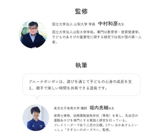 1. 発育ステップに沿った遊び方を専門家と提案「寝返り期→ズリバイ期→お座り~ハイハイ期→つかまり立ち期→伝い歩き期→歩行期」といった子どもの成長を6ステップに分けて、その時期にぴったりなブルーナボンボンの遊び方や関わり方を提案。山梨大学 学長 中村和彦先生、東京女子体育大学 講師 堀内亮輔先生といった遊び・発育の専門家のお二人による解説を新たに掲載しました。