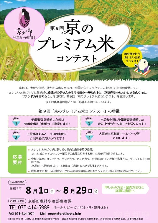 【京都府】おいしいお米づくりに取り組む農業者を募集 ~第9回「京のプレミアム米コンテスト」の開催について~