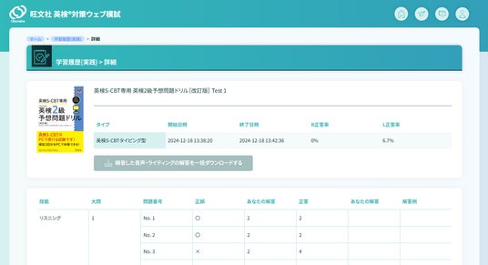 ウェブ模試では、リスニング・リーディングは自動で採点され正答率もすぐに確認できます。スピーキング・ライティングは自分の解答を保存して復習できます。