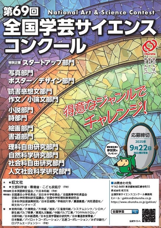 教育出版の株式会社旺文社(東京都新宿区 代表取締役社長 粂川 秀樹)は、主催する「第69回 全国学芸サイエンスコンクール(通称:学コン)」の作品募集を6月2日より開始いたしました。
