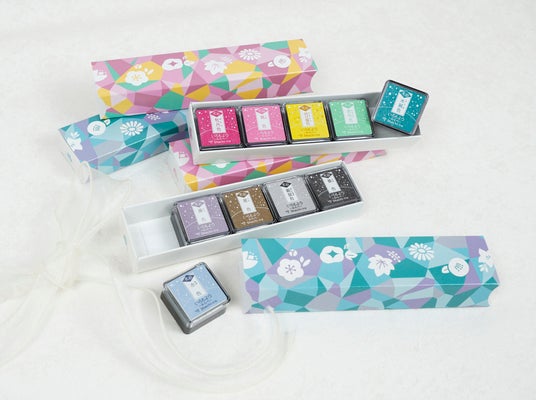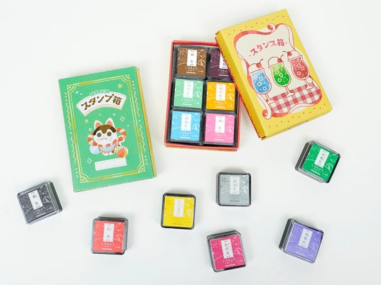 スタンプアート用スタンプパッド「いろもよう わらべ」から、お好みの色を6点選んで購入いただくと、オリジナルボックスを無料でお付けする「いろもよう わらべ紙箱セット」を数量限定でご用意しました。オリジナルボックスは、可愛いレトロなクリームソーダと張子人形“犬張子(いぬはりこ)”の2種類をご用意しています。