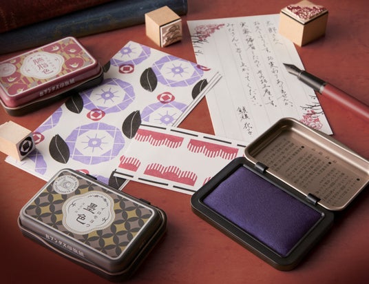 をコンセプトに、大正末期をイメージした懐かしさの感じられる意匠と、改良を重ねた現在のなつ印性能を両立させた創業100周年記念のスタンプ台です。インキ色は、墨色(すみいろ)、臙脂色(えんじいろ)、藤紫色(ふじむらさきいろ)の全3色展開です。
