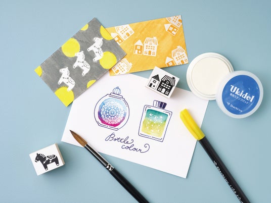 話題の新商品「ウキデル」が、大阪で初登場になります。押した印影の上から万年筆インクや水性ペンで塗ると、色を弾いて下からイラストが浮き出たように見える新感覚の白色のスタンプパッドです。