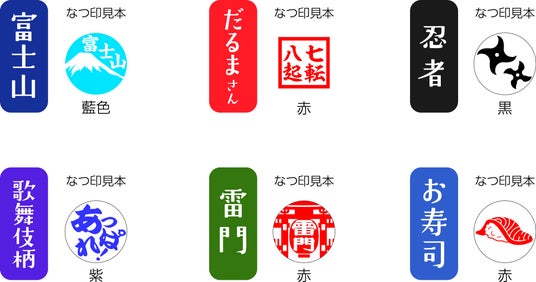 「日本のおみやげはんこ」は、富士山、だるまさんや忍者など、海外の方に人気の高い観光地や文化をモチーフにしたストラップ付はんこです。種類は、「富士山」「だるまさん」「忍者」「歌舞伎柄」「雷門」「お寿司」の6種類。はんこの本体部分は、それぞれにまつわる絵柄となっており、海外からの観光客にも喜ばれる日本ならではのイラスト印面が特長です。インキ内蔵式なのでどこでも手軽に押すことができます。