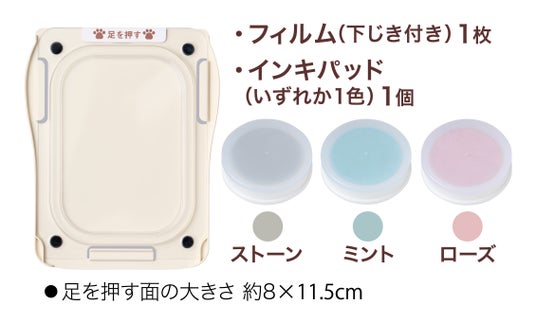 ・肉球が汚れない新たな仕組み!付属のインキパッドを使いフィルムにインキを塗り、フィルムの上から足を押すことで、直接インキに触れずに紙に足形を転写できます。片手でも持ちやすいフィルムサイズ&下じき付きで、足形がとりやすくなりました。