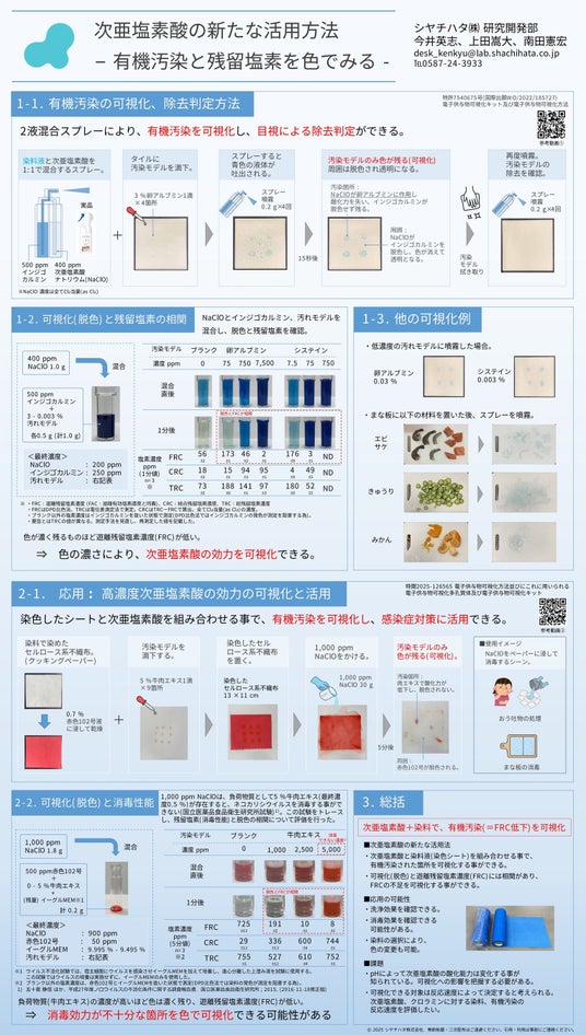 本研究は特許第7540675号「電子供与物可視化キット及び電子供与物の可視化方法」を活用し、有機物除去の判定と次亜塩素酸の効力の“見える化”を目指した。