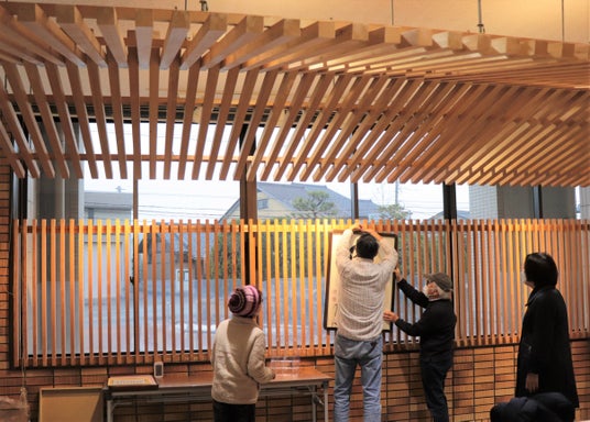 市役所1階ロビーには、あわら市地域ブランドメッセージ「あぁ、あわら贅沢。」のロゴマークを中心に、平成28 年に実施した市民アンケートで意見が多くあがった「あわら市=温泉」のイメージを踏襲し、温泉街の落ち着いた雰囲気を醸し出す「格子」をディスプレイしたスペースがあります。