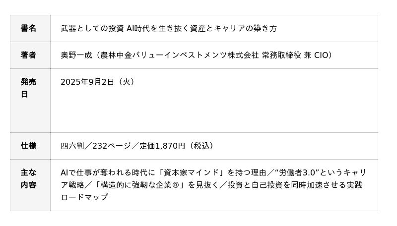 農林中央金庫グループの投資運用・助言会社である農林中金バリューインベストメンツ株式会社(代表取締役社長:酒見 直秀、以下「NVIC」)は、常務取締役兼最高投資責任者(CIO)である奥野一成が執筆した書籍『武器としての投資 AI時代を生き抜く資産とキャリアの築き方』を、2025年9月2日(火)に株式会社KADOKAWAより出版することをお知らせいたします。