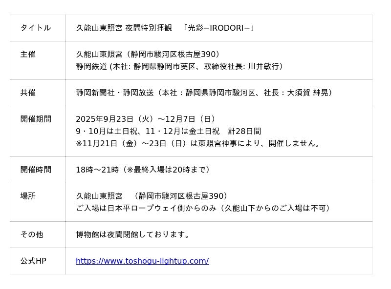 TSP太陽株式会社(本社:東京都目黒区、代表取締役社長:池澤嘉悟、以下「当社」)が、企画・空間演出などを手掛ける、久能山東照宮 夜間特別拝観「光彩−IRODORI−」の開催をお知らせします。