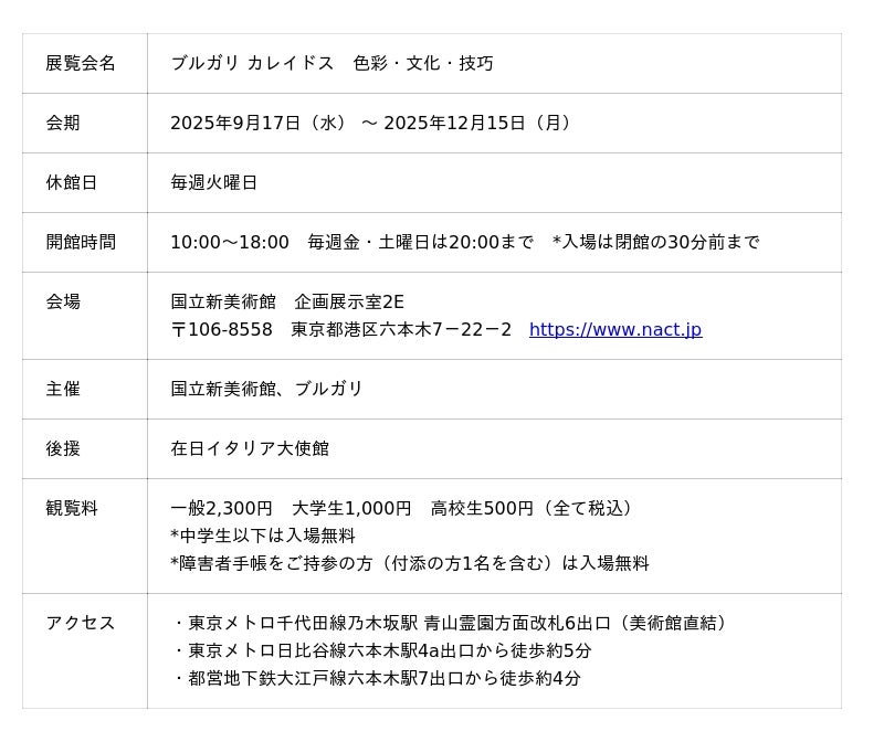 国立新美術館とブルガリは、日本におけるブルガリの過去最大の展覧会「ブルガリ カレイドス 色彩・文化・技巧」を2025年12月15日(月)まで開催しております。「美しい(カロス)」「形態(エイドス)」を意味するギリシャ語にちなんだ展覧会タイトル「カレイドス」は、美と創造性が調和したダイナミックで変化し続ける色彩世界の旅を象徴します。ブルガリ・ヘリテージ・コレクションと貴重な個人コレクションから選び抜かれた色彩のマスターピースというべき約350点のジュエリーは、メゾンの始まりから現在までを跡付けつつ、イタリアと日本の深いつながりを浮き彫りにし、アートとデザインに対する両国共通の情熱や豊かな文化遺産を称えます。