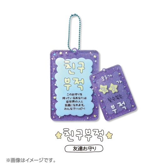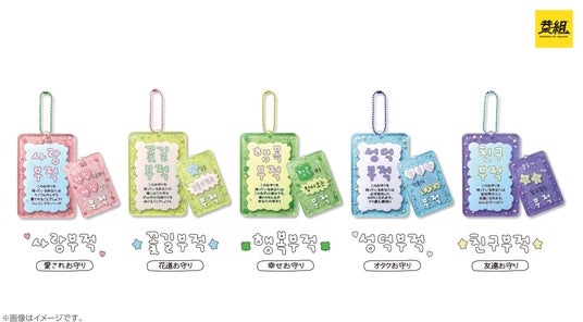韓国語の願いごとメッセージをプリントした、カラフルなお守り型デザインは全5種展開。