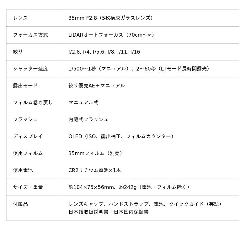最新のLiDAR技術を用いたオートフォーカス、絞り優先AEやマニュアル露出機能、長時間露光、OLEDディスプレイなど、伝統と革新を融合させた設計が特長です。単なる復刻ではなく、フィルム写真の魅力を再発見できる新しい選択肢として、初心者から上級者まで幅広い層から注目を集めています。