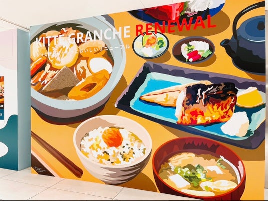 アートが広がるのは、B1Fフロア「ラーメン激戦区」前。食事を楽しむ多くの方々が訪れるこの場所に、『もっとおいしいリニューアル』をテーマに、TOSHIYUKI HIRANOとIORI KIKUCHIのテイストの異なる二人のアーティストが参加しました。