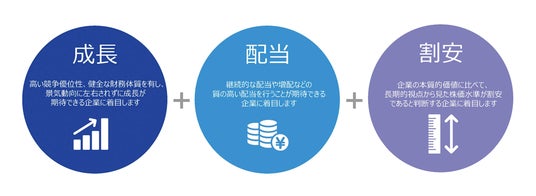 「成長」+「配当」+「割安」の3つの観点に着目して投資を行うことを、当ファンドでは「株式投資の王道」と考えています。