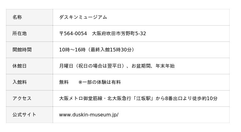 効果的なおそうじ方法やおそうじの歴史が楽しく学べる「おそうじ館」と、ミスタードーナツがこれまでに販売した商品やオリジナルグッズ、店舗デザインの展示、ドーナツの手づくり・トッピング体験ができる「ミスドミュージアム」の2つのスペースで構成され、ダスキンの二大事業を軸に展開する、子どもから大人まで楽しめる体験型ミュージアムです。