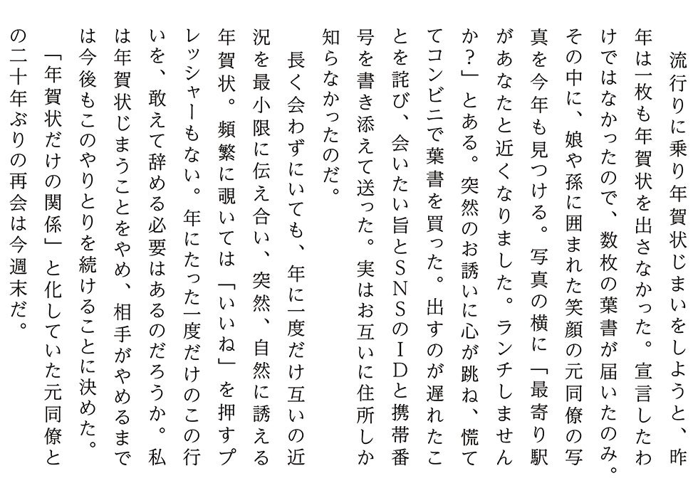第17回の大賞作品は、年賀状じまいをしようと考えていた作者が、旧友から届いた年賀状のメッセージをきっかけに再び年賀状の良さに気づき、続ける決意とともに旧友に会う約束をするエピソードとなっています。準大賞には、アメリカに移住し心細かった作者が、遠い日本から届く祖父の年賀状に元気をもらうエピソードが受賞。その他、SNSにはない年賀状ならではの有り難さや温かさを感じさせる作品が多数選ばれました。今回を含む過去の受賞作品は、受賞作品発表ページで読むことができます。■第17回 年賀状思い出大賞 大賞作品の紹介