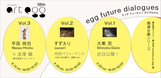 資生堂ギャラリーの新進アーティストを応援する公募プログラム第18回「shiseido art egg(シセイドウアートエッグ)」の関連企画として、「egg future dialogues(エッグ フューチャー ダイアログス)」をそれぞれの個展の期間中に1回、計3回でシリーズ開催します(応募はPeatixより/参加費無料)。