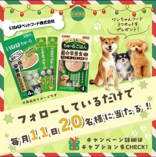 いなばペットフード株式会社(いなば食品グループ本社:静岡県静岡市清水区由比)では、「冷凍ペットフード」公式Instagramをフォローするだけで参加できるプレゼント企画を実施しています。毎月11日に「ワンワンの日」として、フォロワーの皆さまを対象に抽選でワンちゃんフード「3個セット」が当たります。ハッシュタグやコメント投稿などの面倒な作業は不要。気軽に当アカウントをフォローいただき、当選をお待ちください!