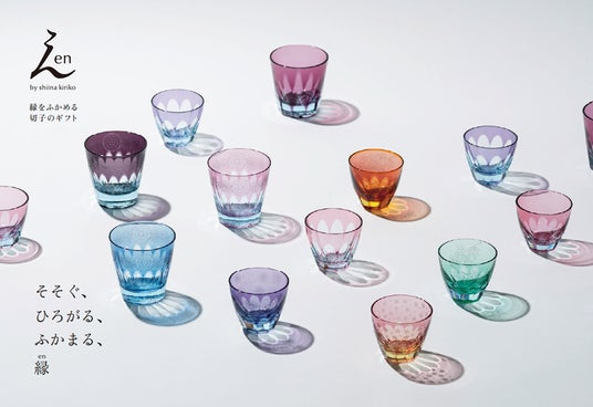 「en」は、椎名切子の中でも贈り物にフォーカスしたギフトシリーズです。コンセプトは「縁をふかめる切子のギフト」。家族への特別な誕生日、友人の結婚祝い、お世話になっている人への贈り物や、外国の方へのお土産など、様々なギフトシーンに選ばれています。「en」の特徴は、グラスにそそぐと、季節を彩る日本の模様が反射してひろがること。繰り返し使っていただくことで、一緒に過ごした季節や祝いの日の情景を思い出し、贈り手と貰い手のご縁がふかまりますように。そんな願いをenに込めてます。