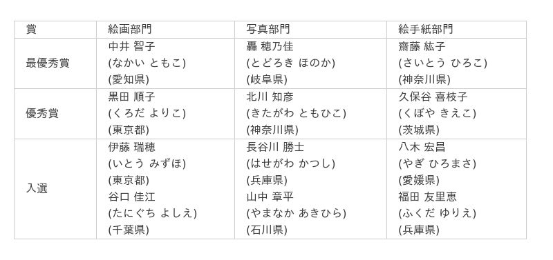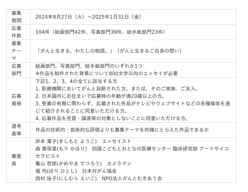 本コンテストは、“がんと生きる想い”を、絵画・写真・絵手紙とエッセイで自由に表現するもので、104点の応募作品の中から、5名の審査員により、絵画、写真、絵手紙の3部門でそれぞれ最優秀賞1名、優秀賞1名、入選2名の、計12作品を選出しました。