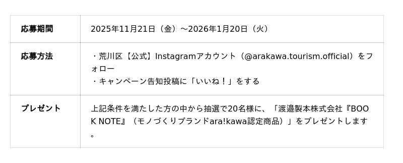 荒川区では、区の魅力をより多くの方に知っていただくため、公式Instagramを活用した「フォロー&いいねキャンペーン」および「フォトキャンペーン」を実施します。抽選で素敵なプレゼントが当たるチャンスとなっています。ぜひご参加ください。