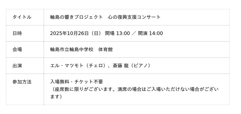 ― 令和6年能登半島地震復興支援・輪島市無料コンサートの開催を支援 ―