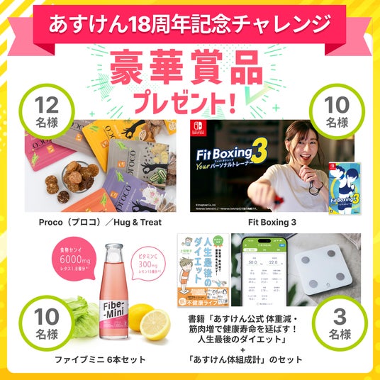 『あすけん』アプリでは、創業18周年を記念して、2つのキャンペーンを開催いたします。<1>豪華賞品が当たる「食事記録5日間チャレンジ」