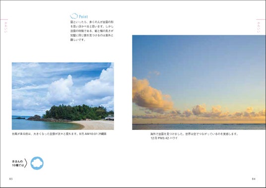 「きほんの10種」ほか、きほんの10種から細分化される雲たちを「かわいい」「きれい」「ふしぎ」「めずらしい」などのカテゴリーで分け、初心者でもわかりやすく雲たちを紹介。また雲だけではなく、光と雲がコラボレーションしてできる美しい現象も多数紹介しました。