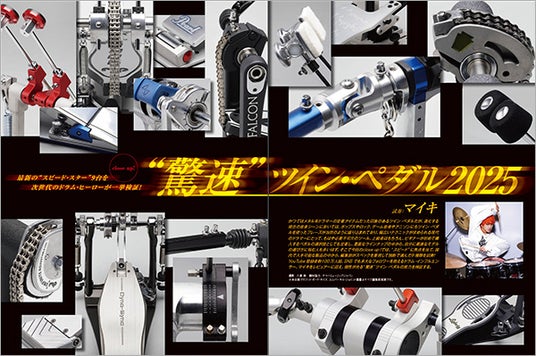 その他にもアーティスト特集として、13年ぶりにドリーム・シアターに復活したマイク・ポートノイ、1月18日、19日に東京ドームで「L'Arc-en-Ciel LIVE 2025 hyde BIRTHDAY CELEBRATION -hyde誕生祭-」を開催したL’Arc-en-Cielのyukihiroをそれぞれフィーチャー。前号から続く「昭和100年特集」の後編では、70~80年代に黄金期を迎えた“歌謡曲”に焦点を当て、数々の名曲に参加してきた敏腕ドラマーの田中清司と、彼を尊敬して止まない国民的スター、野口五郎、“昭和歌謡の証人”2人によるスペシャル対談が実現。さらに昭和を彩ったバンドの中から、矢沢 透[アリス]、大間ジロー[オフコース]、上田雅利[チューリップ]という3名のドラマーのインタビューを掲載。計30ページに渡って昭和ニッポンの音楽/ドラム・シーンを振り返ります。また、現代のドラマーにとって必須のツイン・ペダルを、“スピード”に焦点を当てて試奏する機材特集には、YouTube登録者数100万人を超えるドラム・インフルエンサーのマイキがレビュアーとして登場!