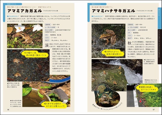 たくさんの写真から、カエルがよくいる場所とその周囲の環境がよくわかる写真を厳選して掲載。どのような環境にカエルがいるのか視覚的に分かります。さらに、カメラマンの松橋さんがフィールドでカエルを見つけるためのさまざまなコツを伝授!「どこを探すといいのか?」「いつ探しに行くとよいのか?」「どのように近寄ると逃げられにくいか?」など、カエルごとに異なるさまざまなテクニックを公開しています。