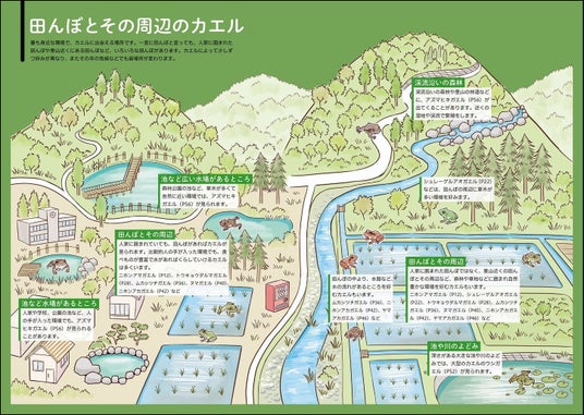 本書では、比較的身近に見られるカエル17種と南西諸島など離島で見られる26種、合わせて43種のカエルの見つけ方を解説しています。よくいる生息環境ごとに「田んぼとその周辺のカエル」「山や渓流のカエル」「島のカエル」の3章に分けているので、どのような環境を探せばよいか分かります。