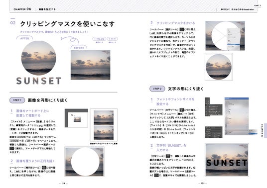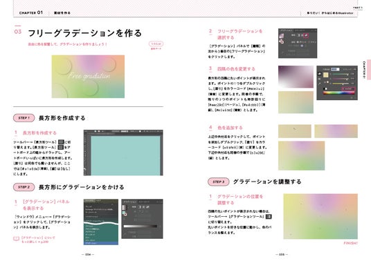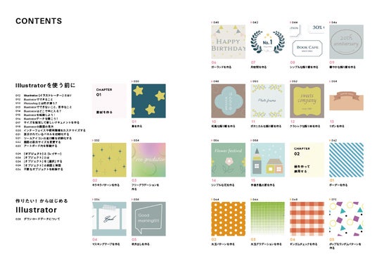 「作りたい!からはじめるIllustrator」では、飾り罫やフリーグラデーション、チェック模様といった基本的なパターン素材から、文字の立体加工、パスを使ってイラストを描く方法、バナーデザインといった、応用の利く作例づくりまでを詳細に解説しています。