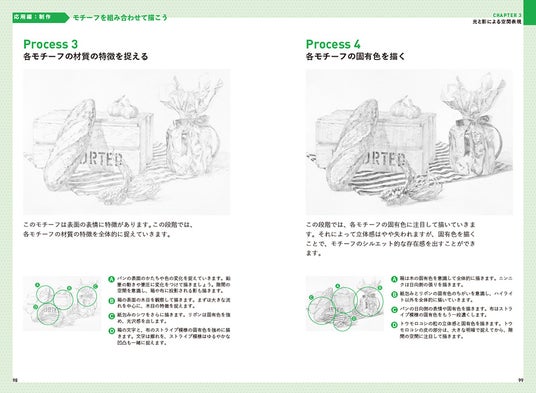 『基礎から学ぶデッサン ミニ帖 描写力を深める[構図・空間・光]の捉え方』P98-99