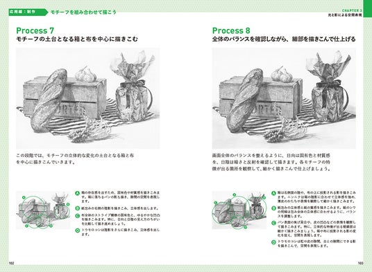 『基礎から学ぶデッサン ミニ帖 描写力を深める[構図・空間・光]の捉え方』P102-103