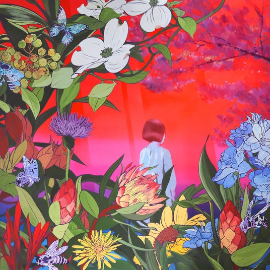 これまでのシリーズでは、植物の色をあえて一度漂白するように描いてきましたが、作家が自然や不思議さに驚嘆する時(センス・オブ・ワンダー)は、いつも景色がパッと鮮やかになるということから、新作は植物の固有色を活かした華やかな色合いで描いています。また、メインモチーフとして長年描いてきた、正面を向いた子どもや小宇宙が描かれた瞳の表現にも発展が見られ、背を向けた子どもの姿からは、より一層「我々はどこに向かうのか」というメッセージを強く感じさせます。