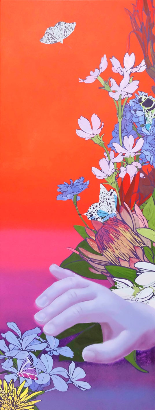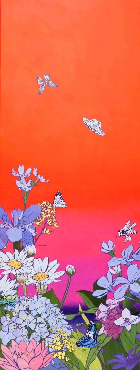 品川美香は、「私とは何か、人間とは何か」というテーマを軸に、子ども、スカル、隕石、山、植物、昆虫などの、作家が選んだ象徴的なモチーフを組み合わせながら、西洋絵画的なリアルさと、平面的な日本絵画的表現を合わせた独自の世界を描いています。