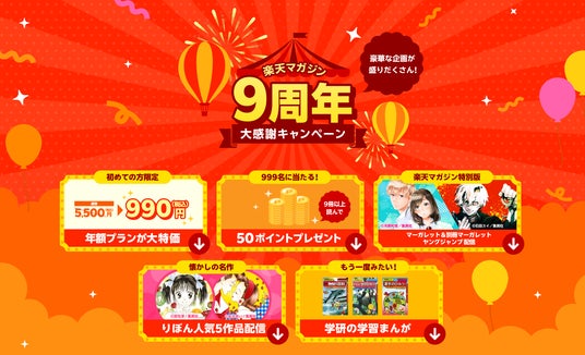 「楽天マガジン」、提供開始9周年を記念して、新規申込者を対象に年額プランが990円(税込)となるキャンペーンを開始