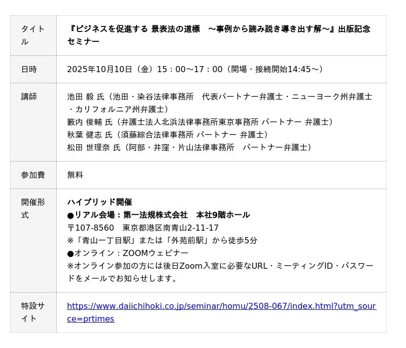 【10月10日開催|無料セミナー】『ビジネスを促進する 景表法の道標 ~事例から読み説き導き出す解~』出版記念セミナー