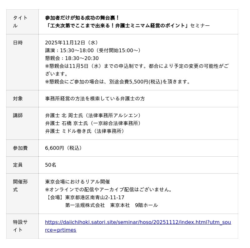 【リアル開催セミナー】参加者だけが知る成功の舞台裏!「工夫次第でここまで出来る!弁護士ミニマム経営のポイント」開催決定!