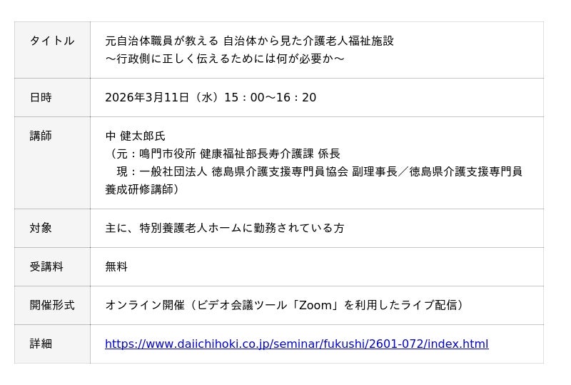 【3月11日開催】無料オンラインセミナー「元自治体職員が教える 自治体から見た介護老人福祉施設~行政側に正しく伝えるためには何が必要か~」