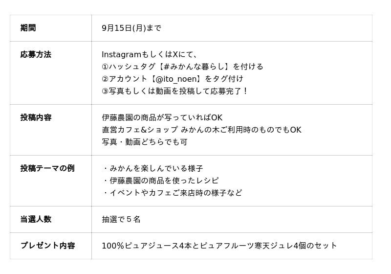 Instagram, Xにて「#みかんな暮らし」を付けた、投稿キャンペーンを開催中です。日常の中で伊藤農園の商品を楽しむシーンをシェアすることで、豪華賞品が当たるチャンスです。