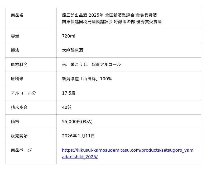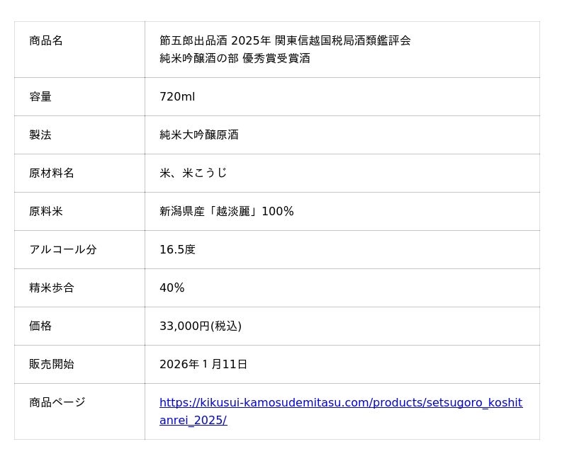 菊水酒造株式会社(所在地:新潟県新発田市島潟750、代表取締役:高澤大介)は、2026年1月11日に、鑑評会で受賞した大吟醸酒「節五郎出品酒(せつごろうしゅっぴんしゅ)」2種を数量限定で発売します。