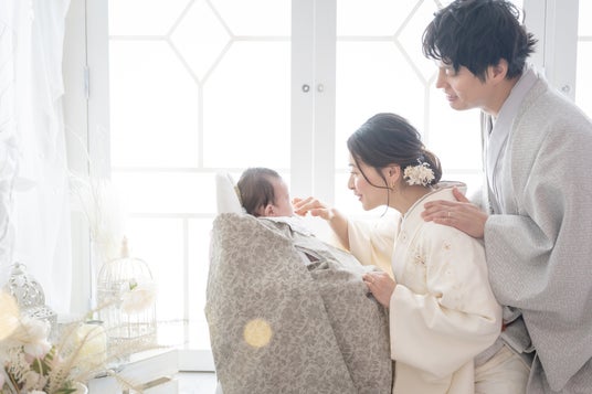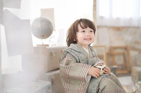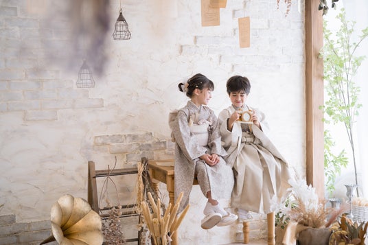 特に、ビンテージとは異なる味わいのコフレオリジナル和装は七五三撮影でも大変人気が高く、ごきょうだいやご家族様のトータルコーディネートのご提案や、お⾐装のレンタルも可能です(※2)。お宮参りの産着レンタルサービスも承っており(※3)、撮影前後1か月の期間であれば無料でご利用いただけます。