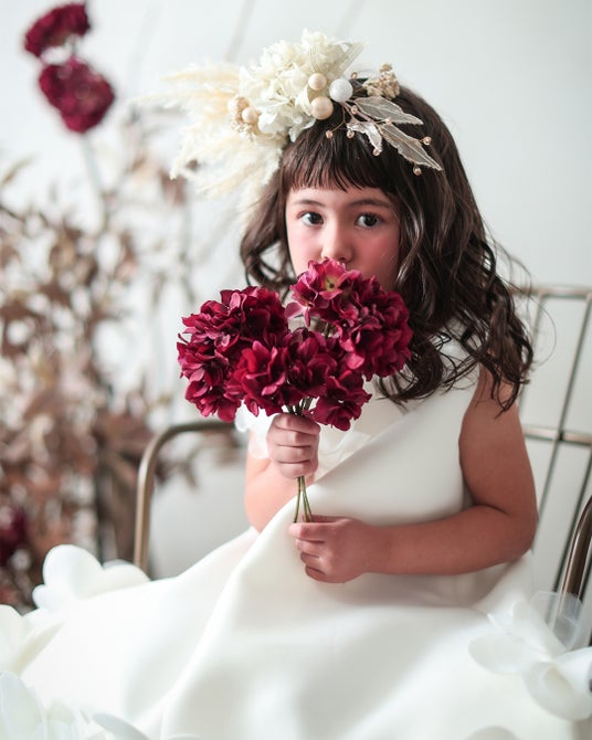 ブライダルヘアメイクの実績を持つメイクアップアーティストをはじめ、経験豊富なスタッフが、お子さまの新たな魅力を引き出します。こだわりのヘアメイクやヘッドドレスに加え、ウェディングで使用する本物のブーケやアクセサリーもご用意しています。