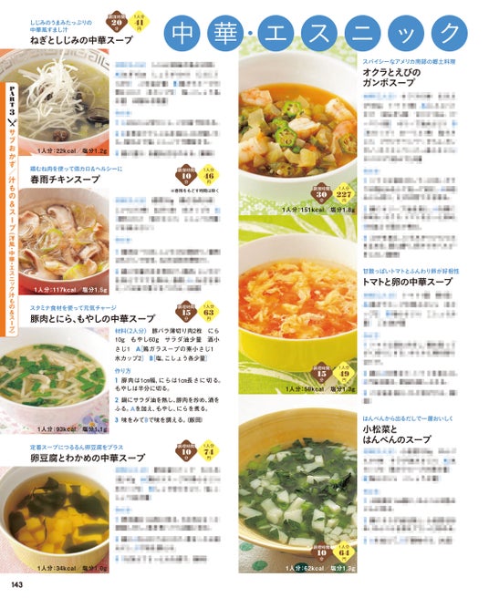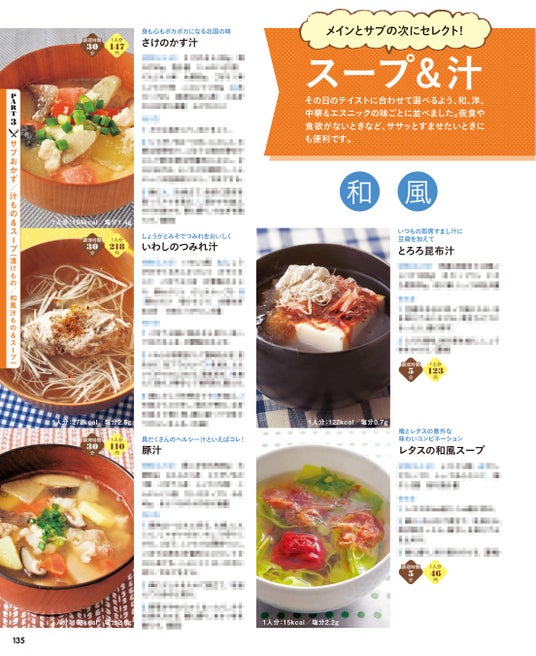 PART2では献立作りの柱になるメインおかずを紹介。「お肉が食べたい」、「冷蔵庫にある野菜を使い切りたい」などなど、その日の気分や冷蔵庫事情で選べるように材料別に並べました。定番からアレンジ系まで充実のラインナップです。メインが決まったら次は副菜選びです。PART3では彩り、味わい、栄養をフォローするおかず、スープと汁ものを種類別に並べました。1品でも数種類でも組み合わせは自由自在。充実した献立作りがラクになります。