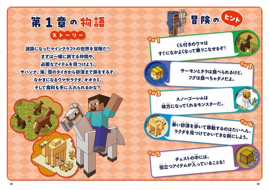 おなじみのスティーブとアレックスと一緒に、ウマやラクダ、オオカミなどのなかまを集めたり、海で魚つりをしたり、村で食べ物をあつめて砂漠を超えたり、さまざまな冒険が楽しめます。