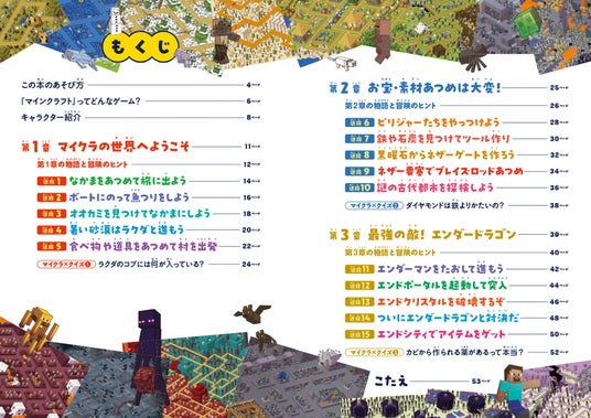 本書は、マインクラフトの世界を舞台に、エンダードラゴンを倒すという目的を果たすべく15種類のステージ(迷路)をクリアしていく、じっくり遊べる迷路ブックです。