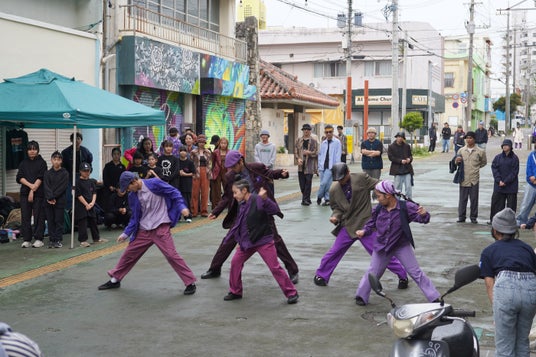 プログラムでは、沖縄県内を代表するダンススタジオ「FLOW」「GET DOWN CLUB」のダンサーたちがフェスを賑やかせてくれました。商店街をダンスホールに変えた、サイファー形式の「ダンスバトルサイファー / Who's the King & Queen of Dance Hall」では観客から歓声が上がりました。またDJブースでは県内外から集まったDJ陣や地元のラッパーが、音楽と地域、そしてミューラルが混じり合うピュアチャンプルーな空間を演出しました。